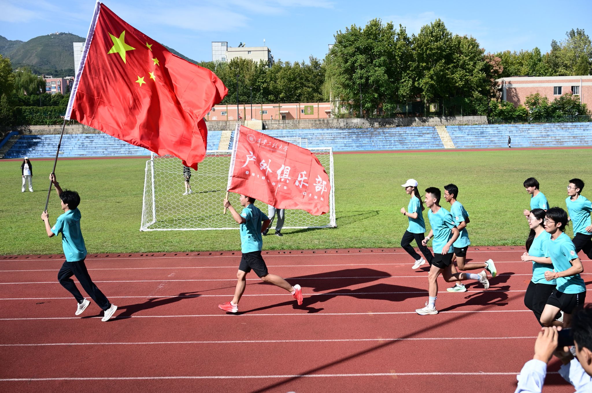 10月1日,威尼斯官网体育部户外队在临潼校区南环操场隆重举行“山河披锦绣 盛世写华章”国庆接力赛,献礼新中国75周年华诞。