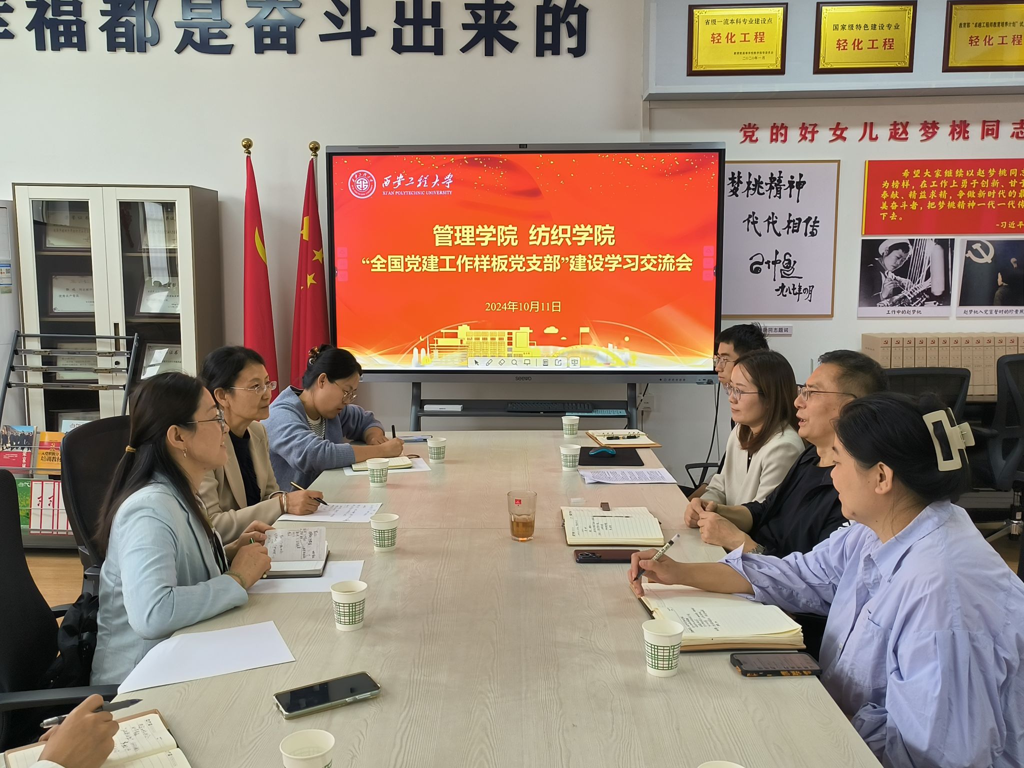 为深入学习贯彻习近平新时代中国特色社会主义思想,全面提升党建工作质量,促进学院间党建经验的互鉴共享, 10月11日,管理学院党委书记王爱华带领第四批全国党建工作样板支部——工商管理系党支部副书记杨静、教工党员张颖颖,组织员吴昌敏赴纺织学院进行“全国党建工作样板党支部”学习交流。纺织科学与工程学院党委书记李伟组织第三批全国党建工作样板支部——智能-功能纺织复合材料创新团队党支部副书记吴帆、组织委员杨雨琪、宣传委员苏金辉,纺织学院组织员苏娜参加会议。