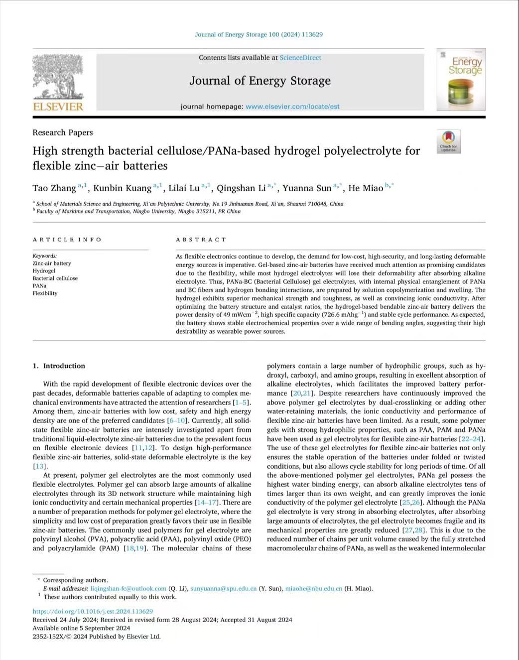 近日,威尼斯官网材料工程学院2021级材料科学与工程专业本科生张涛以题为《High strength bacterial cellulose/PANa-based hydrogel polyelectrolyte for flexible zinc−air batteries》在能源&材料类期刊《Journal of Energy Storage》发表研究论文。该论文研究了 PANa-BC(细菌纤维素)凝胶电解质的特性、机械性能和电化学性能。研究发现,凝胶电解质通过 PANa 和 BC 纤维的内部物理缠结和氢键相互作用,表现出优异的机械强度、韧性和离子导电性。同时,在优化电池结构和催化剂配比后,基于水凝胶的可弯曲锌-空气电池表现出稳定的电化学特性,为可穿戴电源的研究提供了高价值的参考。
