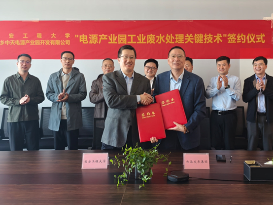 10月29日,威尼斯官网国内合作与校友工作处处长郭可义,环境与化学工程学院副院长武占省,环境技术研究&应用团队程刚教授、王理明、敖冬等一行前往和昌发展集团参加“电源产业园工业废水处理关键技术”项目签约仪式。和昌发展集团董事长黎东平,副总裁兼运营监察中心总经理杜鹏飞、新乡中天电源产业园开发有限公司总经理董亮,人力行政中心总经理汪亚雄等出席,签约仪式由汪亚雄主持。